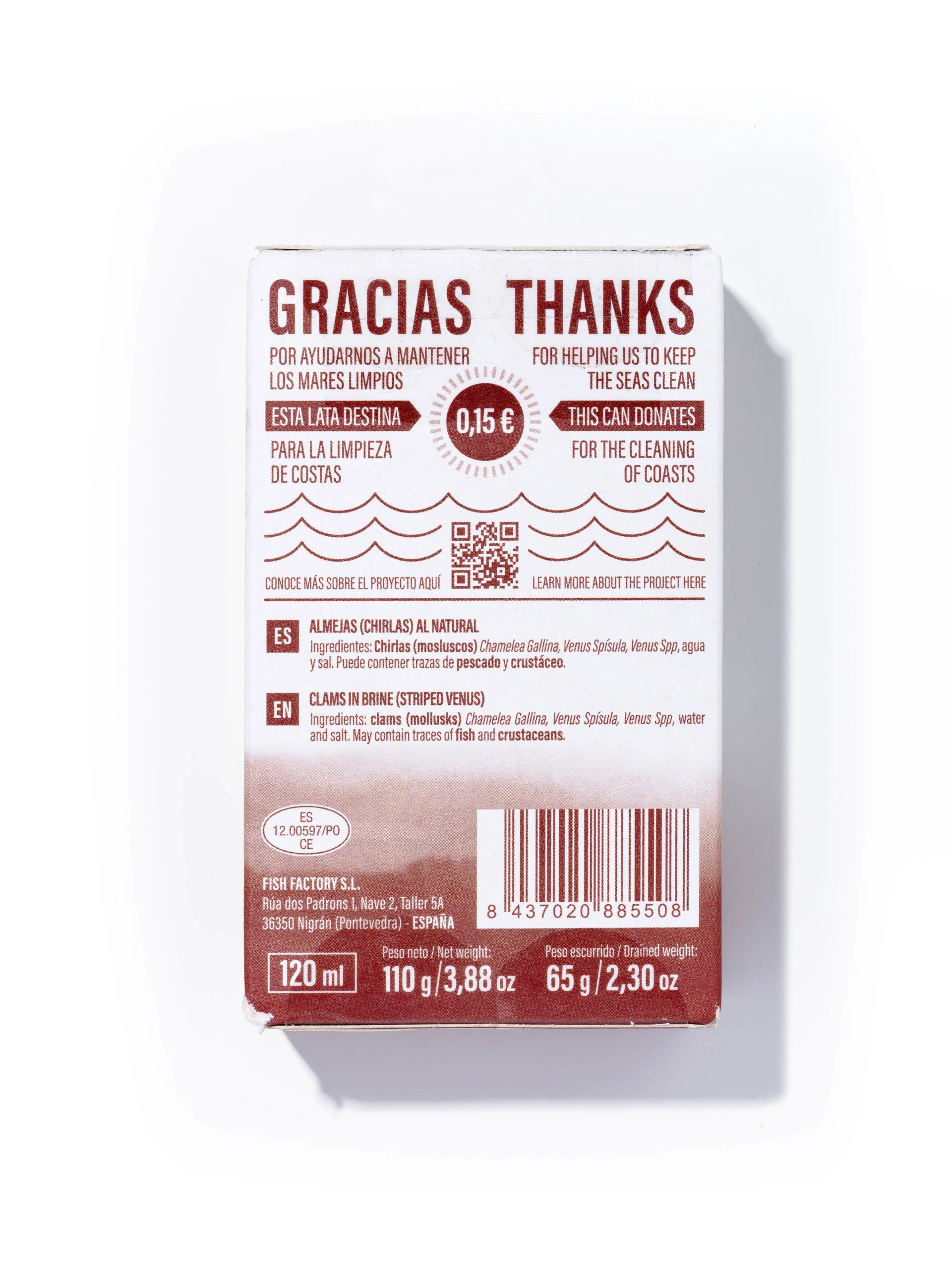 Ingredientes: Chirlas (moluscos) Chamelea Gallina, Venus Spísula, Venus Spp, agua y sal. Puede contener trazas de pescado y crustáceo.